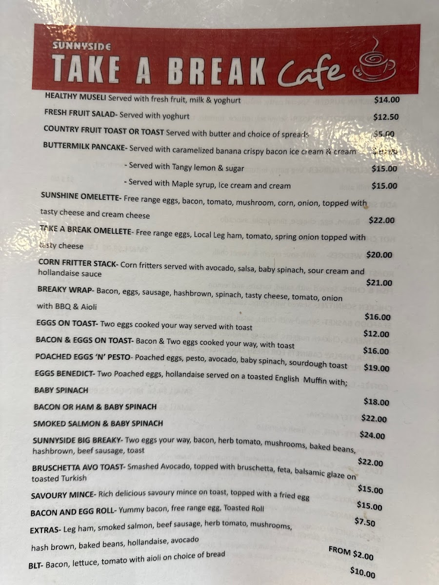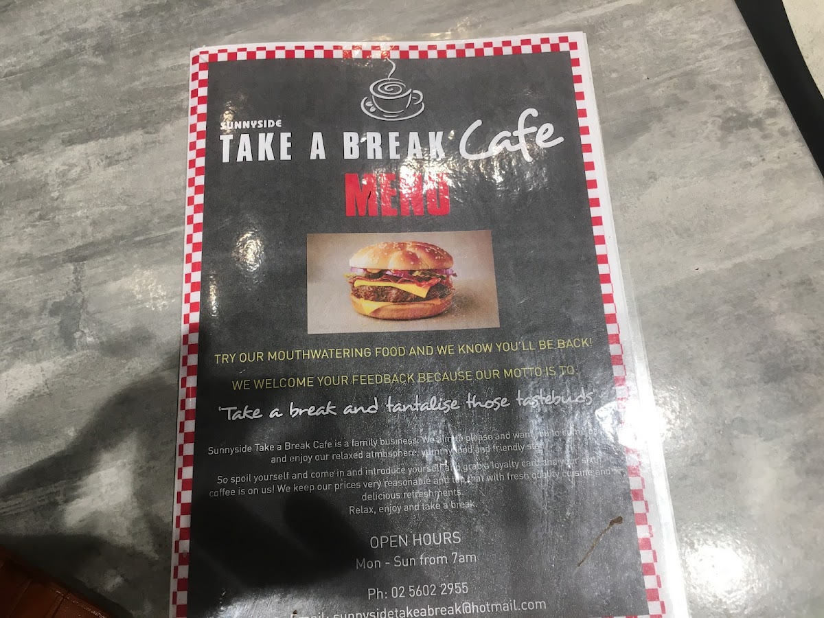In conclusion, the menu at Sunnyside Take A Break Cafe successfully brings together comfort food, classic café beverages, and family-friendly choices, creating an inviting dining experience that feels both reliable and enjoyable.