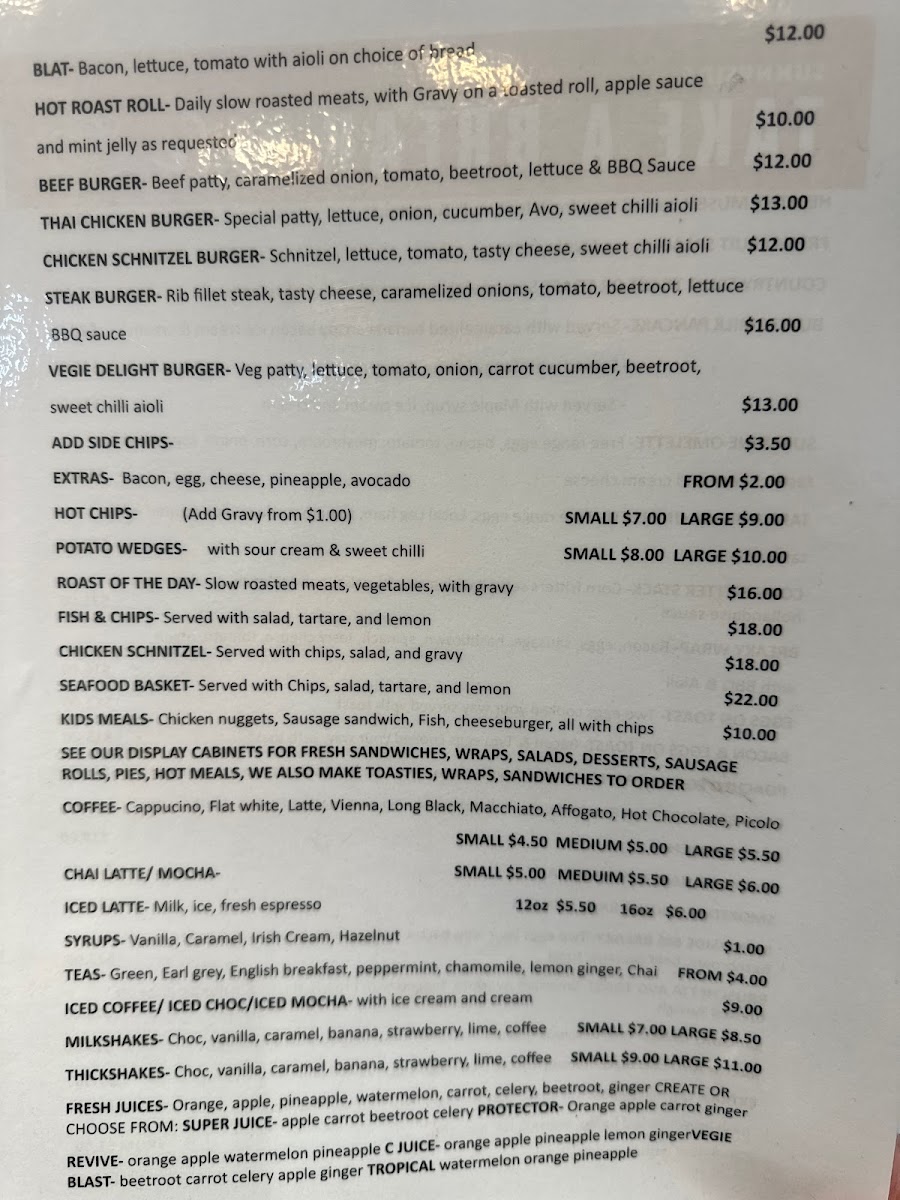 The food menu reinforces this sense of approachability. The Mains section, featuring Hot Chips, Eggs On Toast, Country Toast, Potato Wedges, and Fresh Fruit Salad, highlights simple, satisfying dishes that work well for breakfast, brunch, or a light lunch. For heartier appetites, the Burgers stand out as a strong point of the menu, with crowd-pleasers like Beef Burger, Chicken Schnitzel Burger, Thai Chicken Burger, Steak Burger, and the plant-friendly Veggie Delight Burger (V), ensuring there is something for every preference.