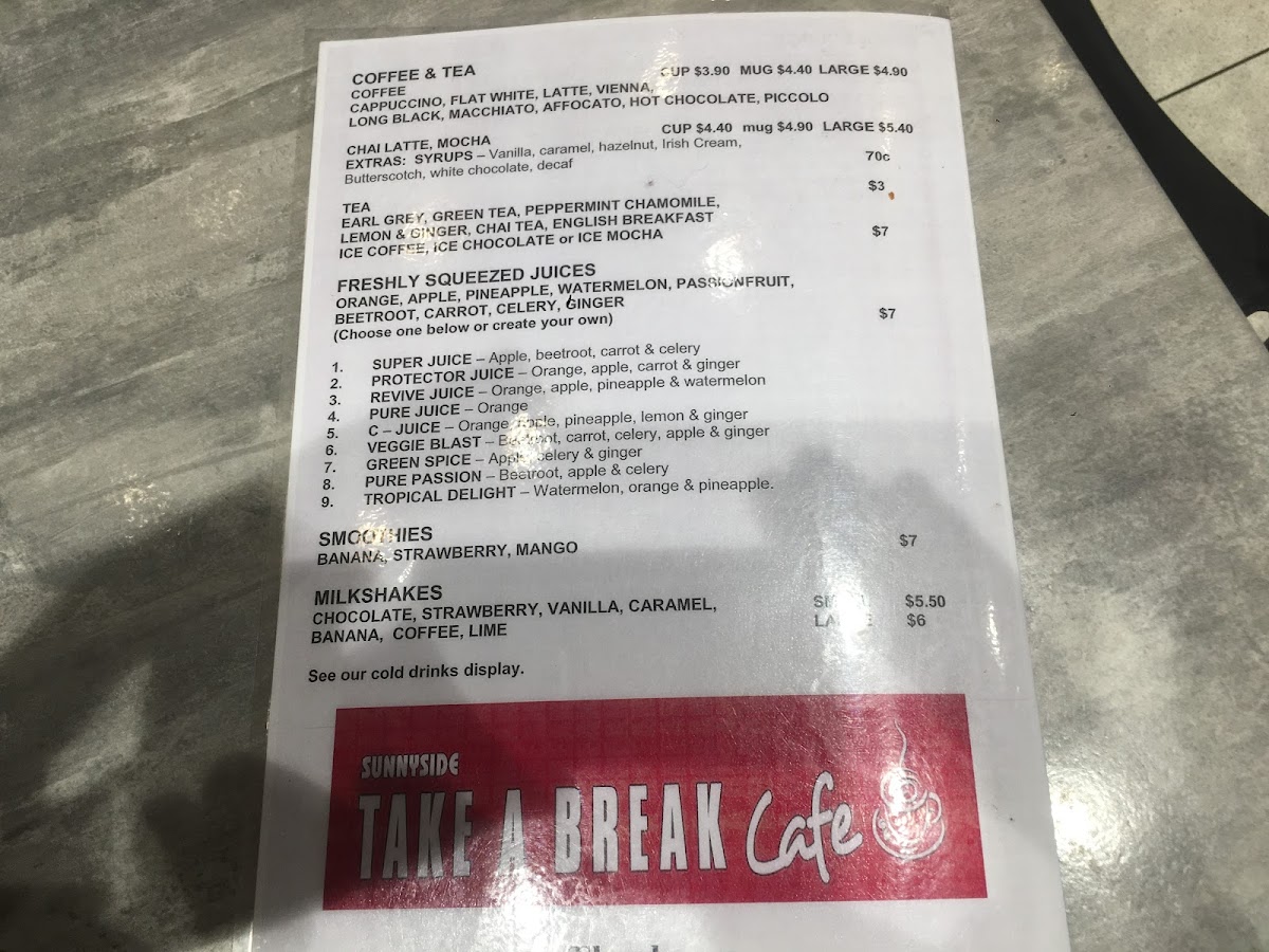 From a reviewer’s perspective, the menu at Sunnyside Take A Break Cafe, located at 40 Wollumbin St, Murwillumbah NSW 2484, Australia, offers a comforting and well-rounded selection that perfectly suits a relaxed café experience. Overall, the menu feels thoughtfully curated, balancing simplicity with variety to cater to locals, families, and travelers alike. The range of Iced Drinks such as Iced Chocolate, Iced Mocha, Iced Latte, and Iced Coffee provides refreshing options for warm days, while the Hot Drinks lineup-including Latte, Chai Latte, Affogato, Long Black, and Cappuccino-adds a classic café touch for those seeking familiar comfort.